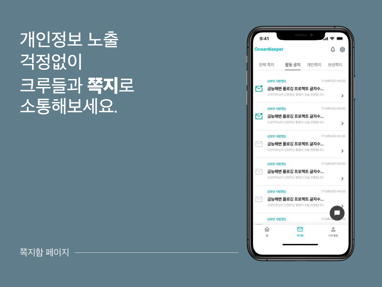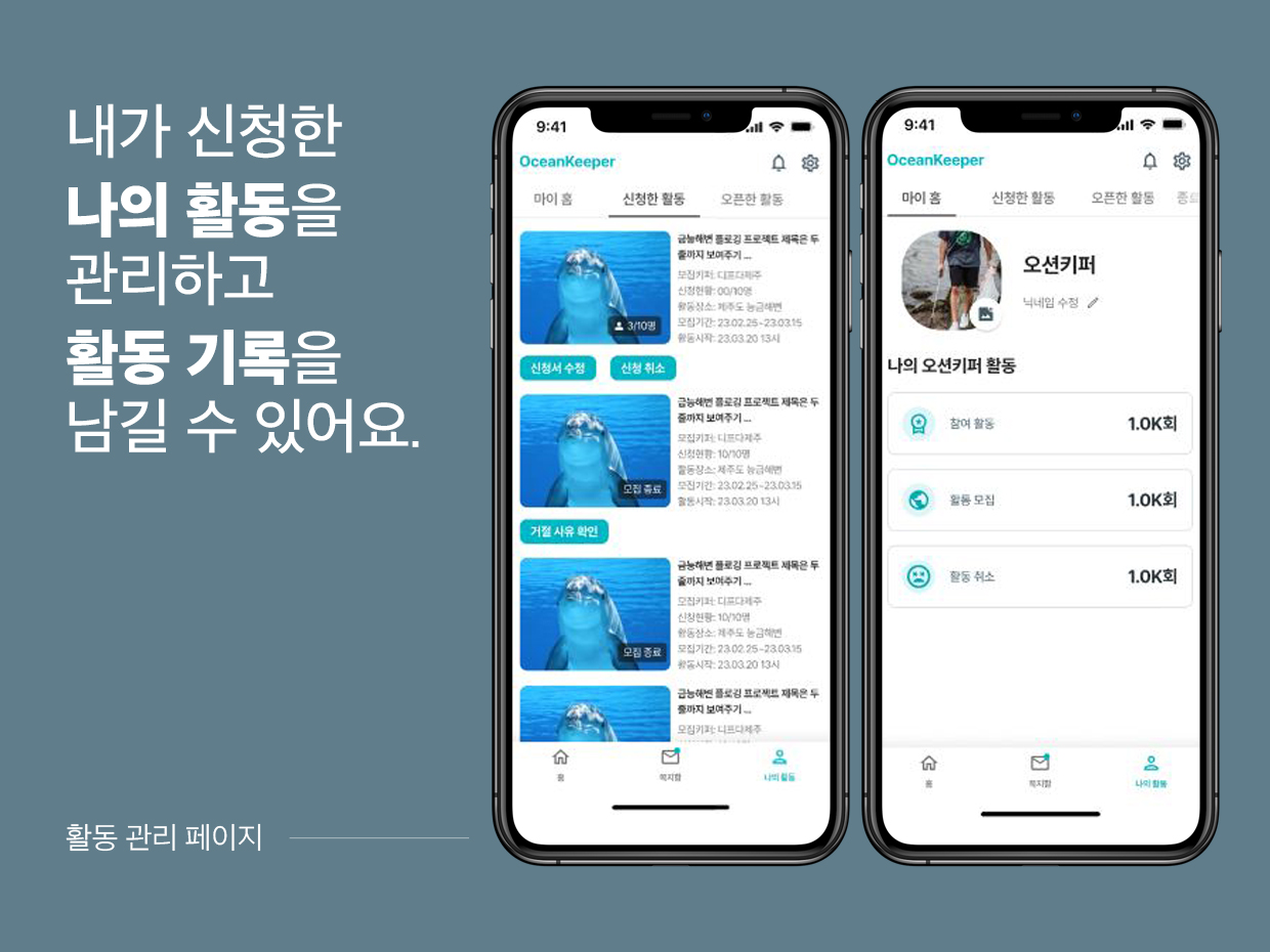 전국 20개 해양정화 풀뿌리시민단체가 참여하는 바다살리기네트워크는 자원봉사자 모집과 관리의 어려움 때문에 고충을 겪고 있었습니다. 자원봉사자들도 인스타그램 공지를 일일이 확인하는 데 불편함을 느꼈습니다. 이러한 문제를 해결하고자 봉사 단체와 자원봉사자가 쉽게 소통하고 활동을 찾을 수 있는 오션키퍼 앱이 만들어졌습니다.