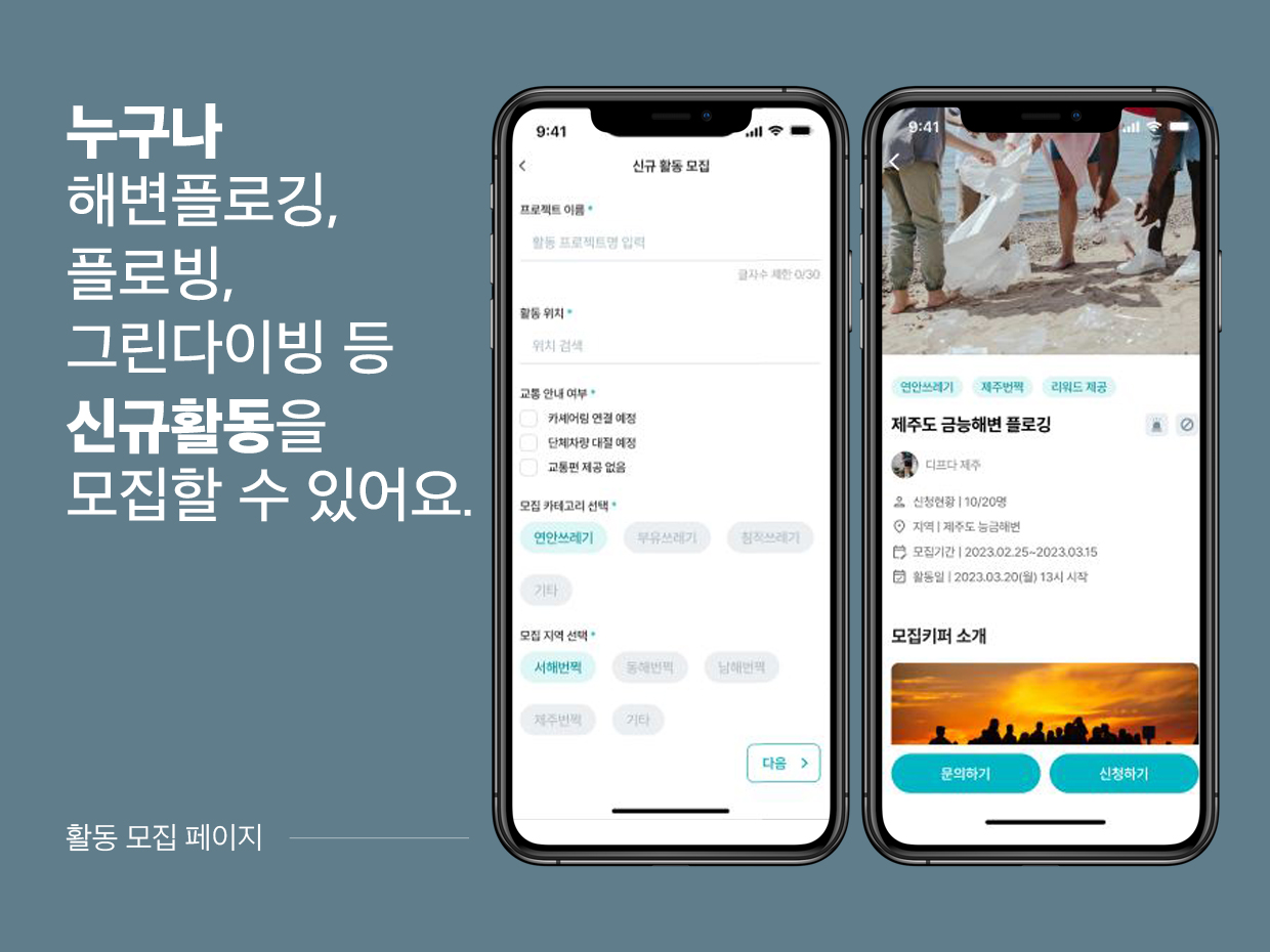 - 어떻게 자원봉사자를 찾는 단체와 해양정화 활동을 찾는 봉사자를 연결하여 체계적인 활동관리, 소통, 활동성과 데이터를 통한 동기부여를 제공합니다