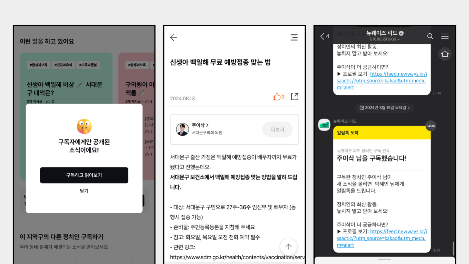 ❷ 연결 - 정치인을 구독하면 정치인의 소식을 카카오 알림톡으로 받아보고 의견을 보내거나 투표를 하는 등의 피드백을 합니다. 정치인은 낮에는 동네 밖으로 나가는 2030 유권자를 온라인으로 만나 소식을 전하며 지지기반을 만들어갈 수 있습니다.