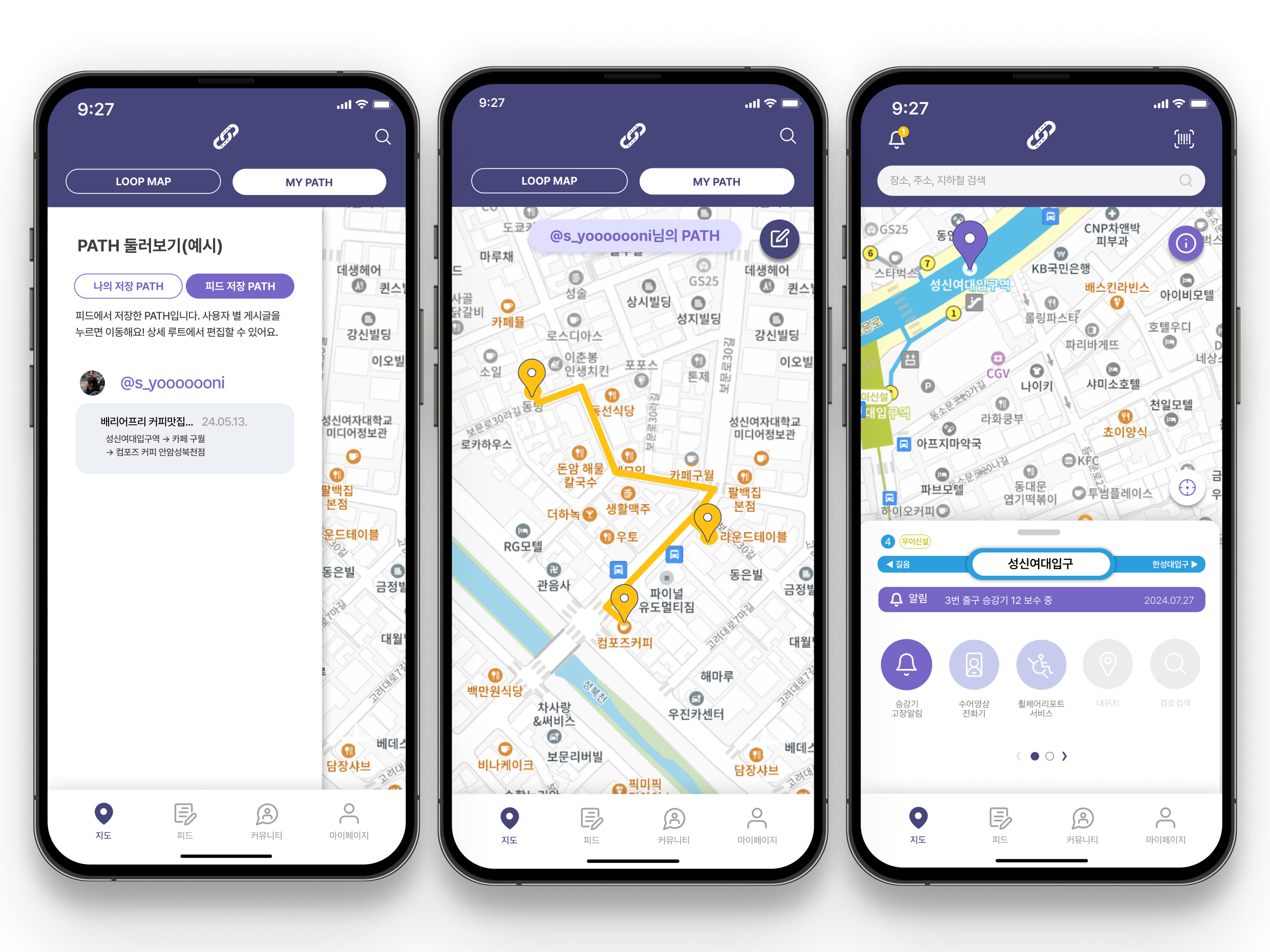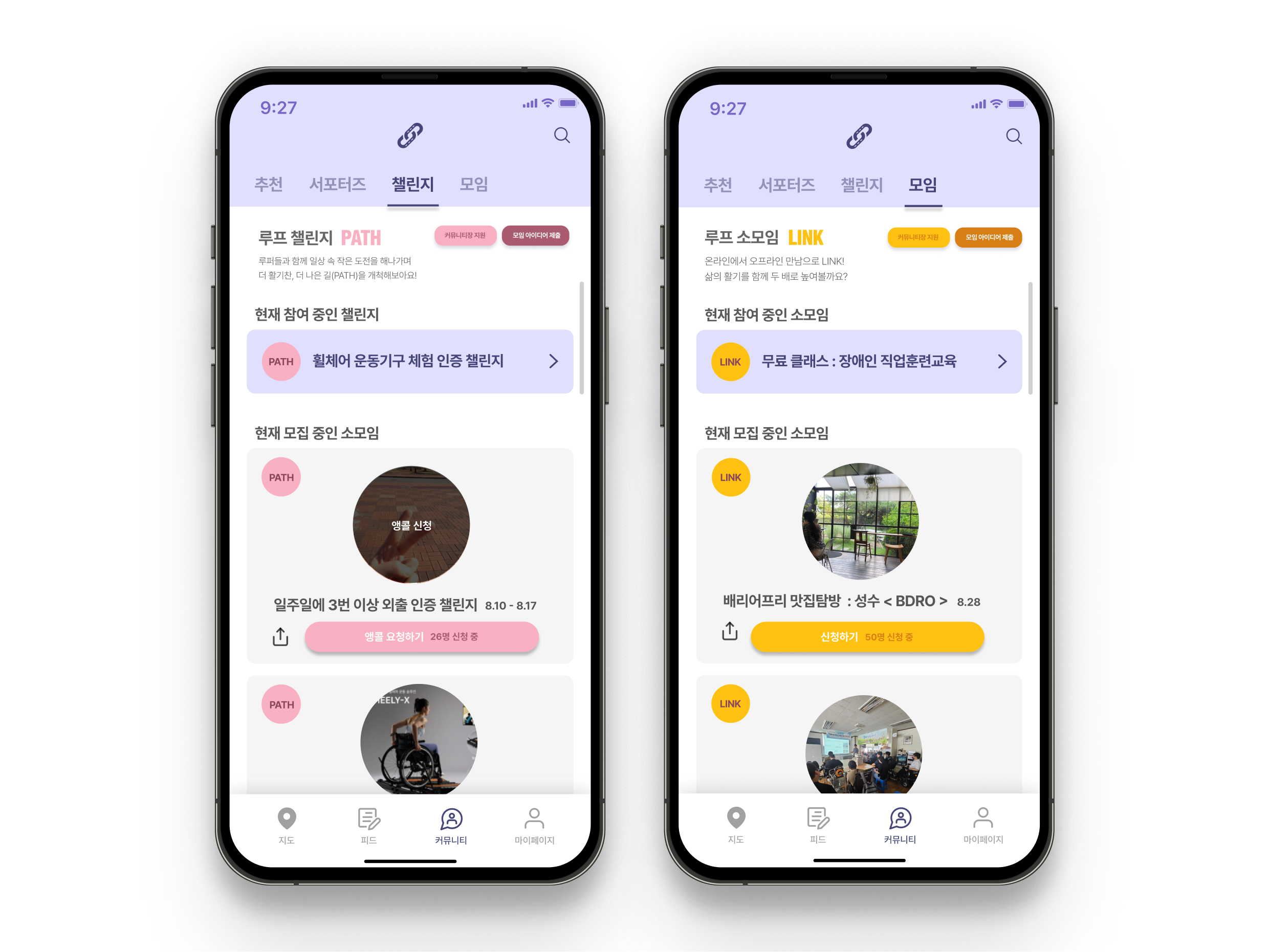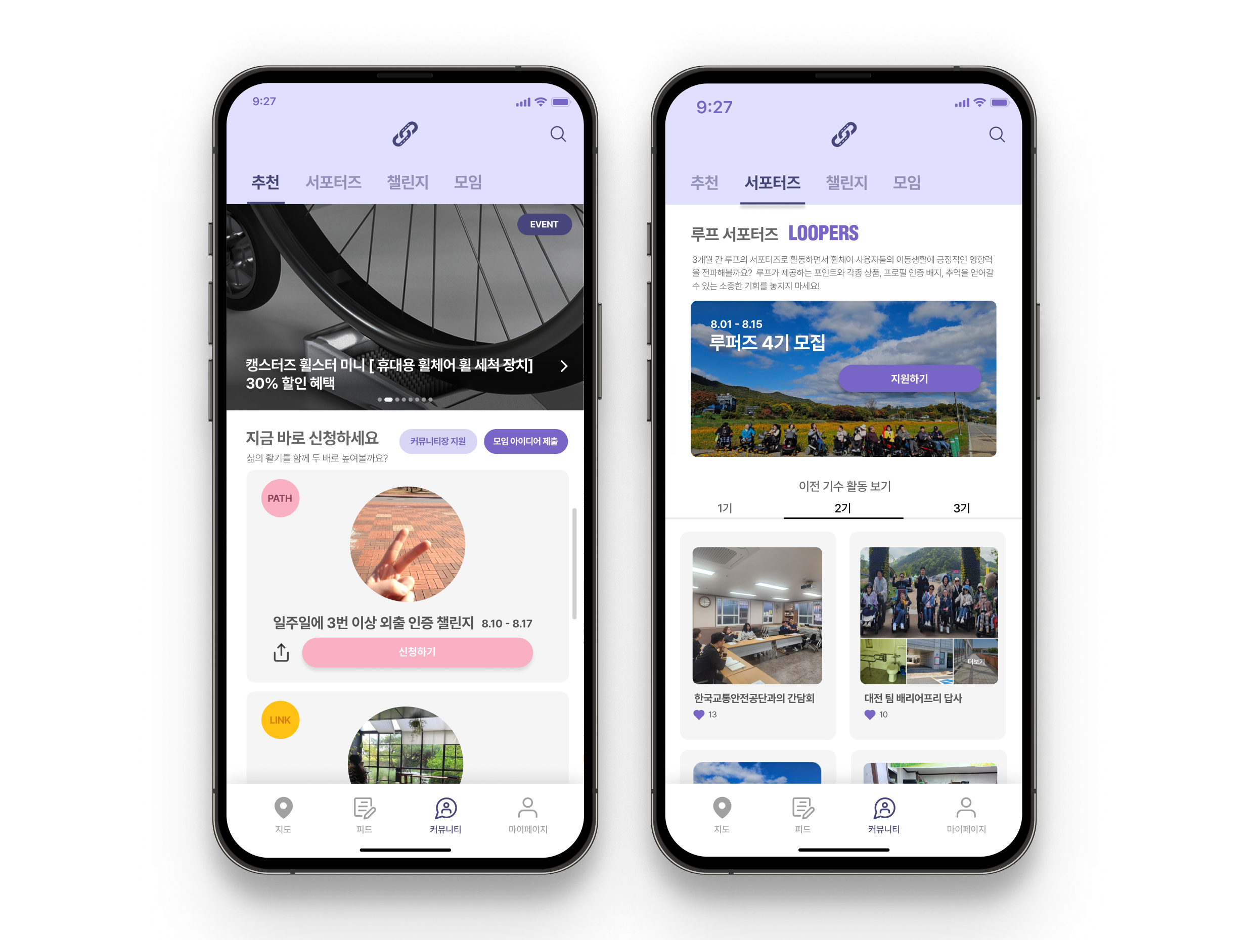사용자들은 지나간 길(Path)의 배리어 프리 정보를 공유하고 다양한 커뮤니티 프로그램에 참여하며 연결(Link)되고, 함께 루프 지도를 만들어나가며 휠체어 사용자들의 더 나은 길(Our Path)을 도모합니다.