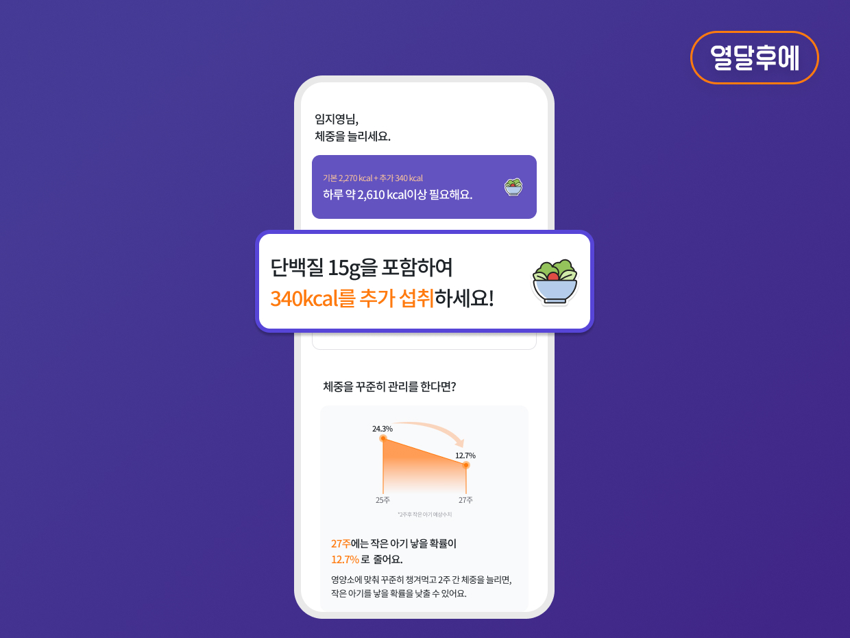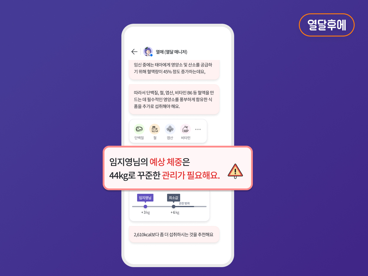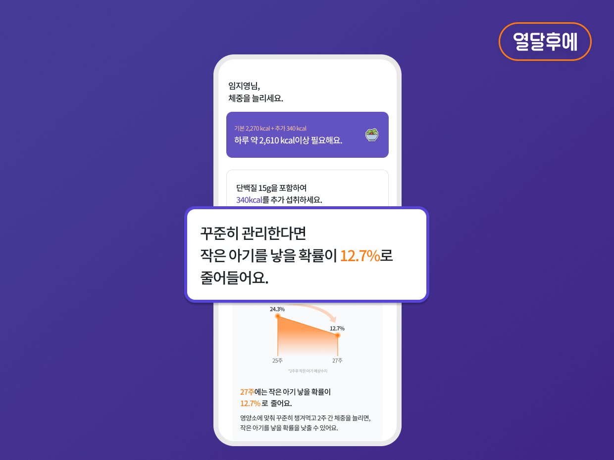임신부 회원의 BMI와 임신주차별 체중 증가 수준에 따라, 작은아기 출생 상대위험도를 예측하고, 개선을 위한 가이드를 제공합니다. (상대위험도 예측 알고리즘은 3년간 저희가 유저로부터 수집한 대한민국 전체 태아 34%의 성장데이터, 전체 임신부 26%의 체중 데이터 약 400만건을 기반으로 만들어졌습니다)
