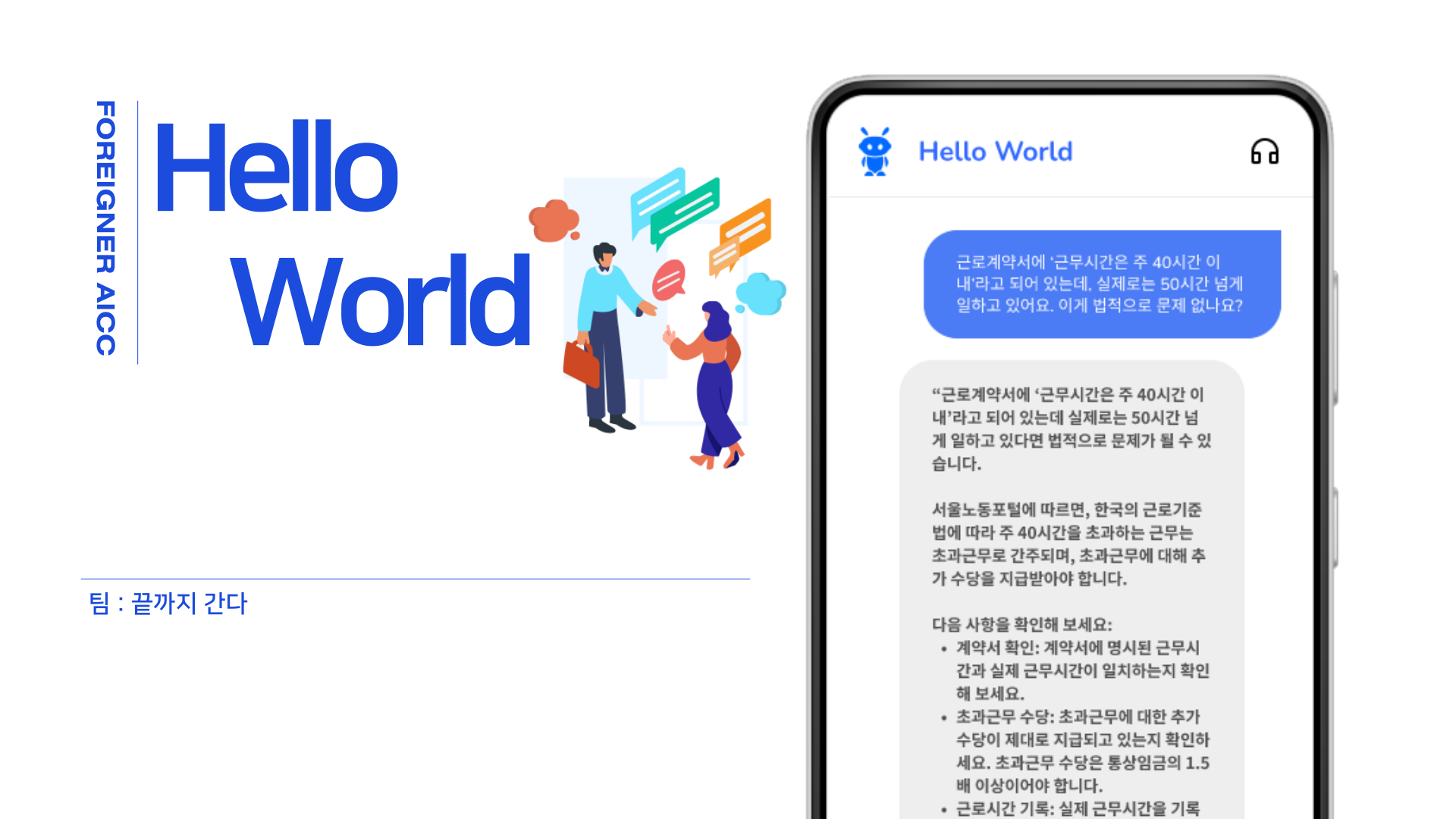 Hello World는 외국인 근로자 올케어 지원 서비스로서 AI 기반의 고객센터(AICC)를 통해 다양한 지원을 제공하고, 취업을 위한 자소서 쓰기까지 모든 필요를 한 곳에서 해결할 수 있는 통합 플랫폼입니다. AICC에서는 다국어 법률 번역 데이터, 법률/규정 텍스트 분석 데이터, 그리고 다양한 법률 상담 사례 등을 활용하여 외국인 근로자에게 법률, 비자, 생활, 취업 지원 정보를 제공합니다. 사용자는 STT, TTS를 포함한 챗봇을 통해 질문을 하고 더 필요한 정보가 있다면, 희망하는 상담 일정을 선택하여 상담사와 직접 상담할 수 있습니다. 또한, 챗봇과의 대화 요약 데이터를 상담사에게 제공하여 상담사의 고충을 덜어줄 수 있고, 더욱 정확한 정보로 상담이 이루어져 상담 효율성이 극대화 됩니다. 취업지원에서는 AI기반 외국인 취업 맞춤 자기소개서 작성과 일자리 공고를 소개해주어 이를 통해 외국인 근로자들은 원스톱으로 필요한 정보를 획득하고, 효율적인 상담 지원을 받을 수 있습니다.