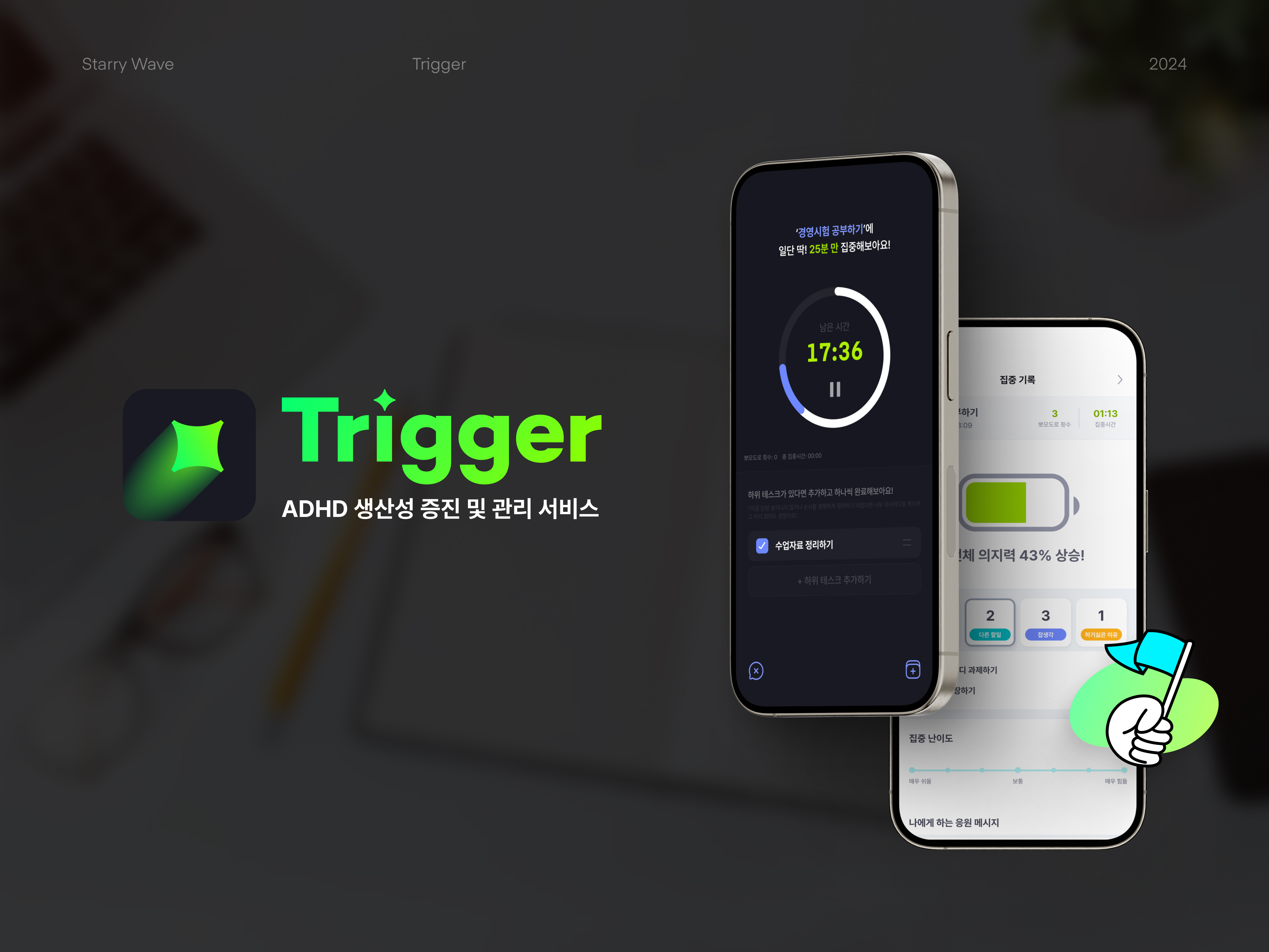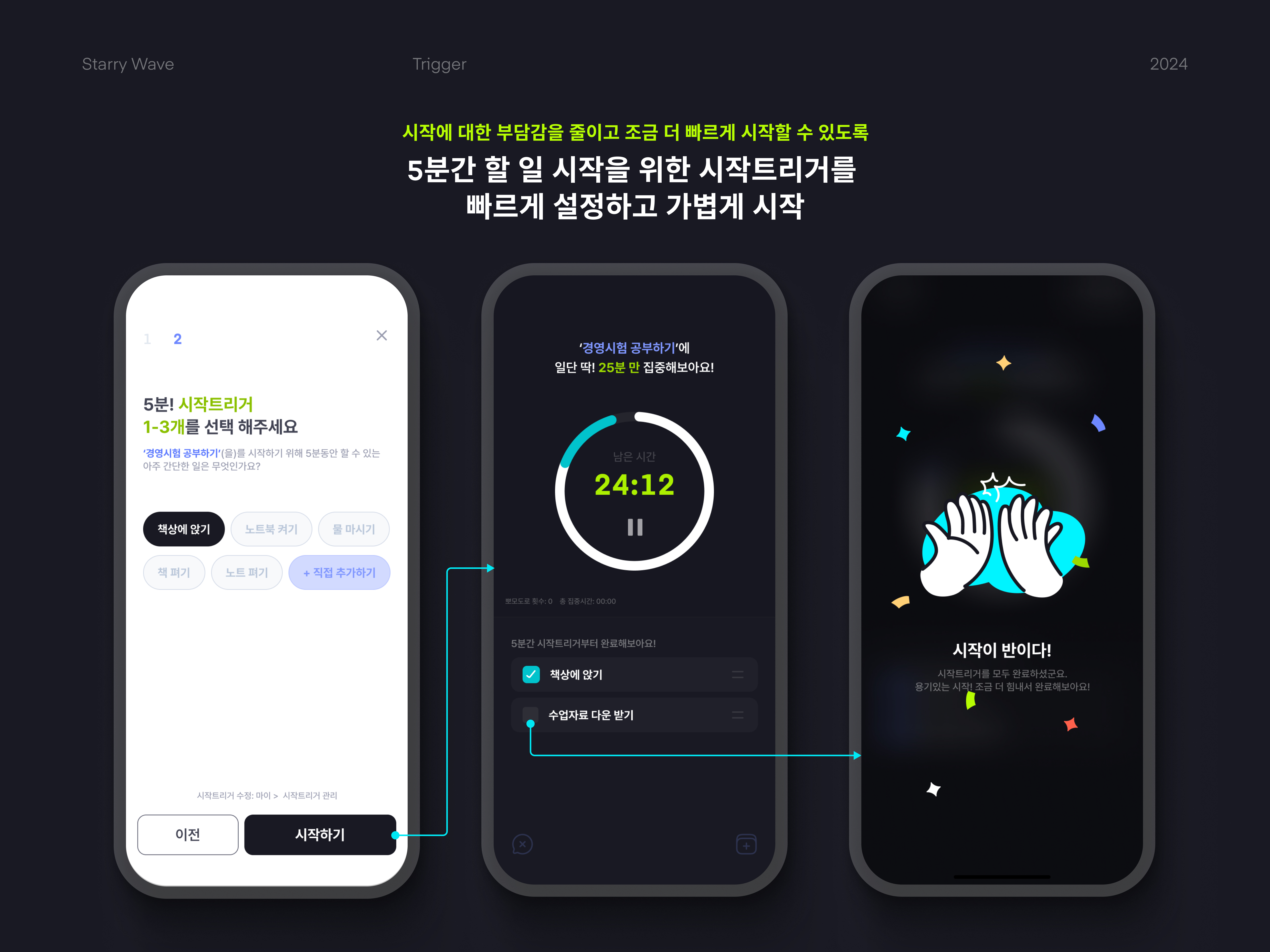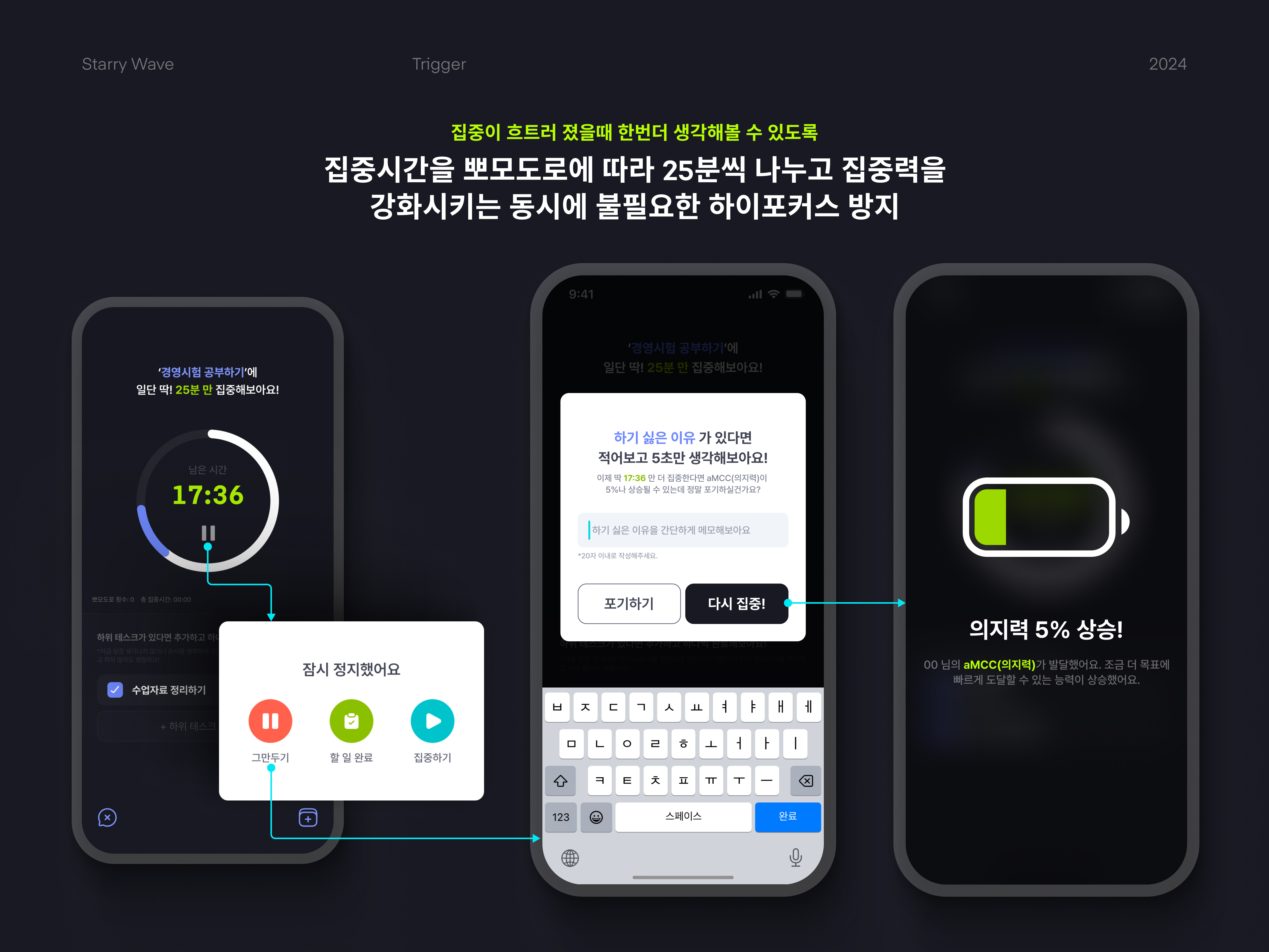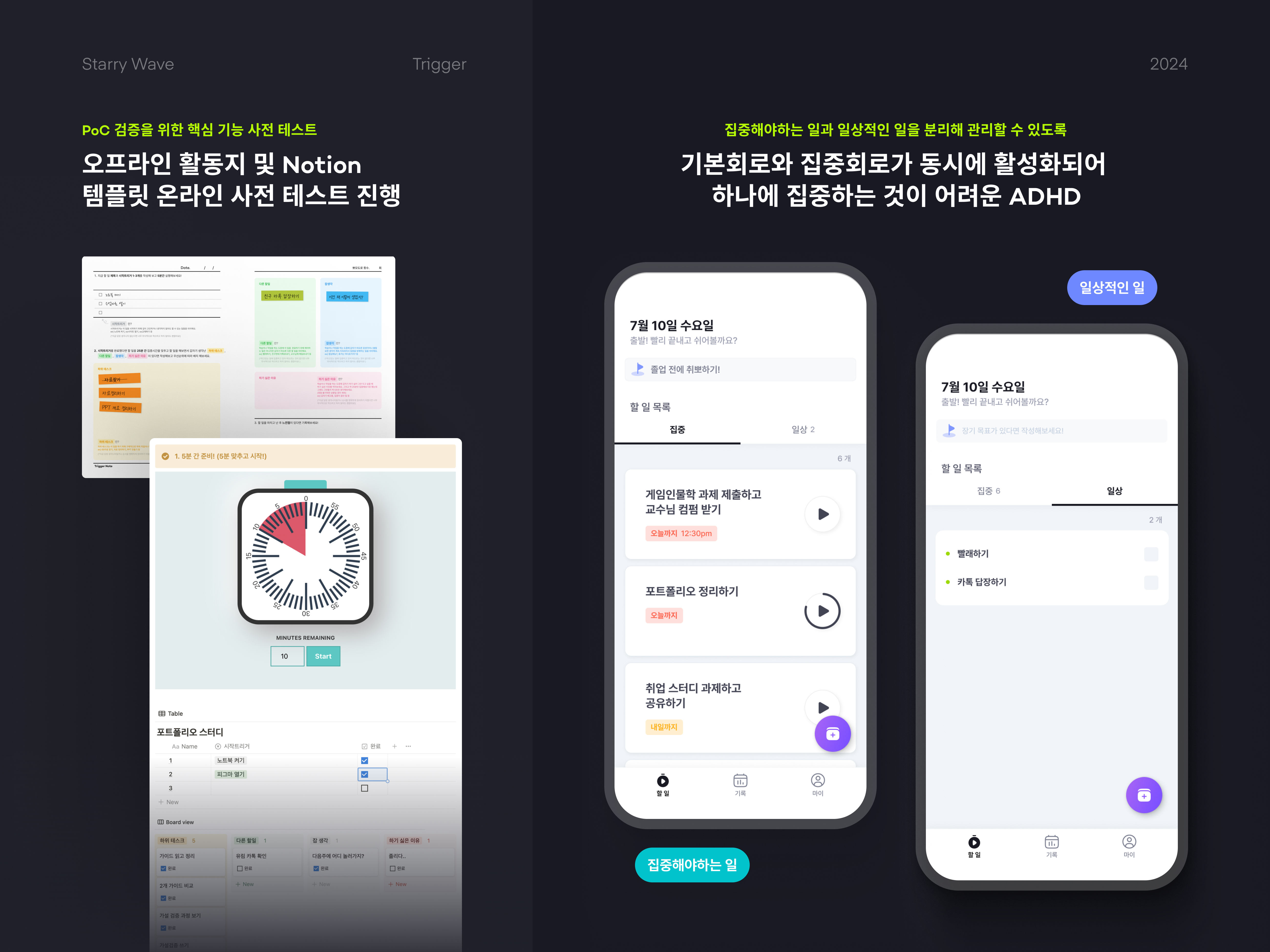 할 일을 관리할 수 있는 모바일 앱입니다. 할 일을 생성할 때 영향력과 시급도를 설정할 수 있으며, 이를 기준으로 할 일이 정렬됩니다. 사용자는 해당 알고리즘과 별개로 특정 할 일을 즐겨찾기하여 최상단에 위치시킬 수 있습니다. 할 일 타이머를 시작하면 시작을 용이하게 하는 시작 행동, 트리거를 5분 안에 하도록 타이머가 돌아갑니다. 트리거를 끝내면 25분 간 할 일을 하고 5분 휴식하는 뽀모도로 타이머가 시작됩니다. 할 일을 하는 도중에 하위 태스크를 추가할 수 있고, 잡생각이나 다른 할 일이 떠오르면 분류하여 적을 수 있습니다. 할 일을 도중에 끝내려고 하면 5분만 더 해보자는 선택지가 나타나고, 중지하려고 하면 해야 하는 이유와 하기 싫은 이유를 적음으로써 동기를 지속하게 합니다. 할 일을 전부 끝내면 그 일을 하면서 들었던 생각들과 하기 싫었던 이유 등을 모아 볼 수 있는 기능을 제공할 예정입니다.